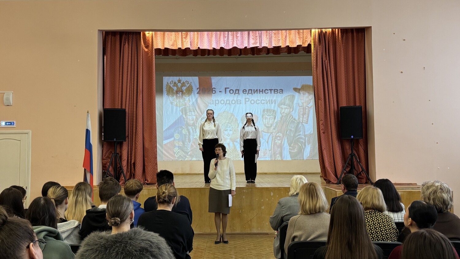 В преддверии Татьяниного дня — Дня российского студенчества (25 января) — в Филиале ГОУ ВО МО "Государственный социально-гуманитарный университет" в г. Зарайске — Зарайском педагогическом колледже состоялось яркое мероприятие, посвященное празднику и торжественному открытию Года единства народов России 2026 года. Студенты и преподаватели объединились в атмосфере дружбы и культурного многообразия: звучали поздравления от администрации, творческие номера с национальными танцами и песнями народов России. Событие подчеркнуло роль молодежи в сохранении традиций и укреплении единства страны, став отличным стартом для года патриотических инициатив. | |