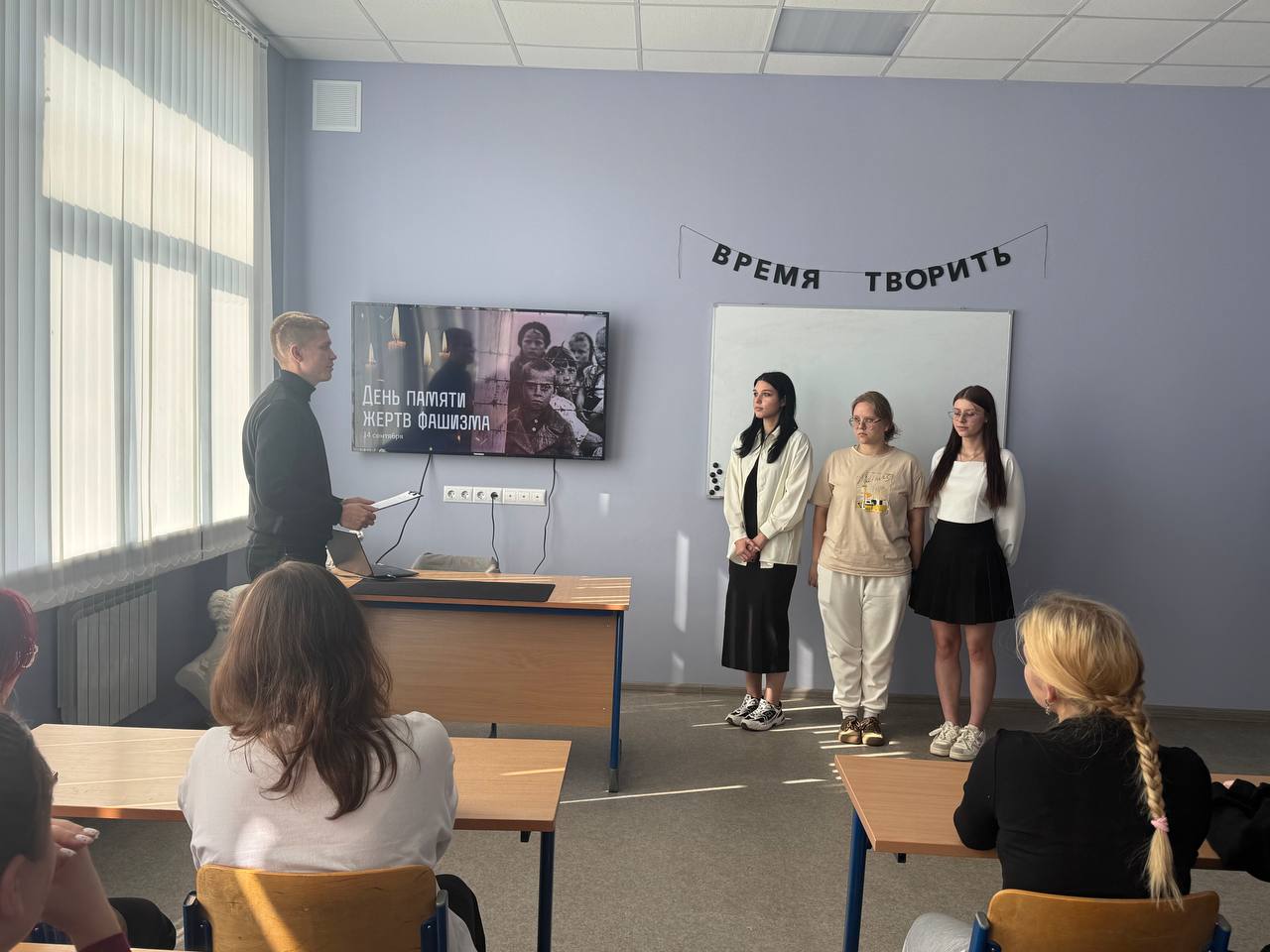 Ежегодно каждое второе воскресенье сентября в России и в других странах мира вспоминают о жертвах нацисткой Германии и её союзников во время Второй мировой войны. 14 сентября преподаватель истории Дергачëв С. Н. провёл урок памяти, посвящённый Международному дню памяти жертв фашизма. В рамках мероприятия были раскрыты причины и последствия фашистских преступлений. Сергей Николаевич особо подчеркнул, что сохранение памяти об этих ужасных событиях важно для нас сегодня, чтобы не допустить возрождение фашизма и избежать различного рода оправданий действий военных преступников. | |