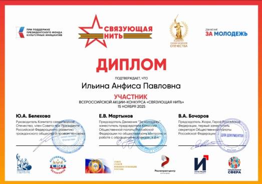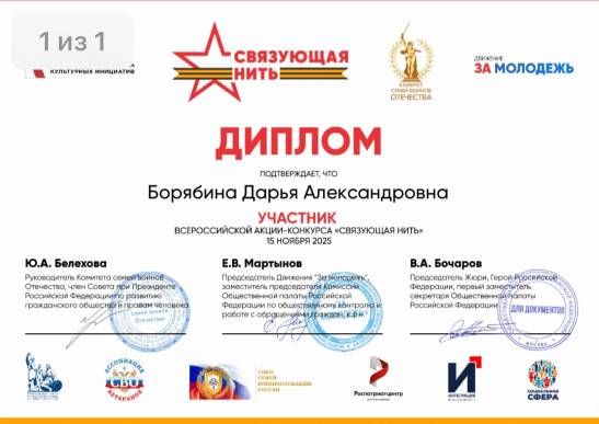 Студенты колледжа вошли в число финалистов призеров Всероссийской акции-конкурса «Связующая нить». Цель Конкурса — изучение истории своих семей в контексте Великой Отечественной Войны и Специальной Военной Операции, формирование у детей, подростков и молодежи чувства патриотизма и ответственности за будущее страны, гражданской идентичности, вовлечение их в творческую деятельность, связанную с военной славой России. Проект стартует именно в 2025 году, ведь это год празднования 80-летия Победы в Великой Отечественной Войне и Года защитника Отечества. Эта большая, народная и всероссийская акция, где каждый в возрасте от 8 до 23 лет может поделиться своей семейной историей – рассказать о подвигах своих родных и близких во времена Великой Отечественной Войны и подвигах сегодняшнего дня – в рамках проведения Специальной военной операции. | |